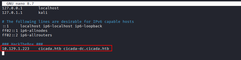 Nmap done: 1 IP address (1 host up) scanned in 140.70 secondsThe scan revealed multiple services consistent with a Windows Domain Controller, including DNS (53), Kerberos (88), LDAP (389/636/3268/3269), SMB (445), RPC (135/593), and WinRM (5985). The LDAP service identified the domain as cicada.htb, and the certificate subject confirmed the hostname CICADA-DC.cicada.htb.