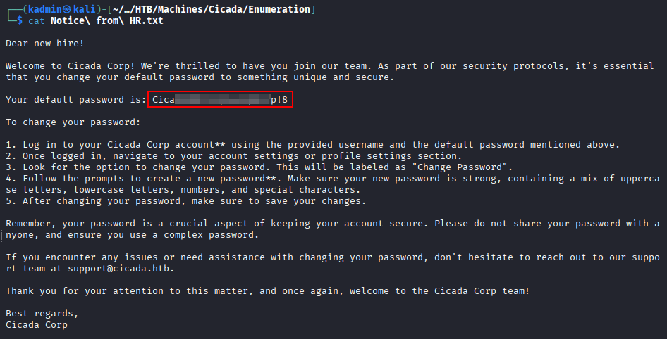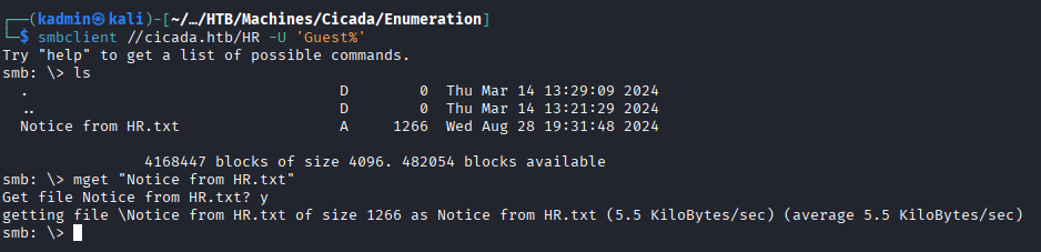 smbclient //cicada.htb/HR -U 'Guest%'