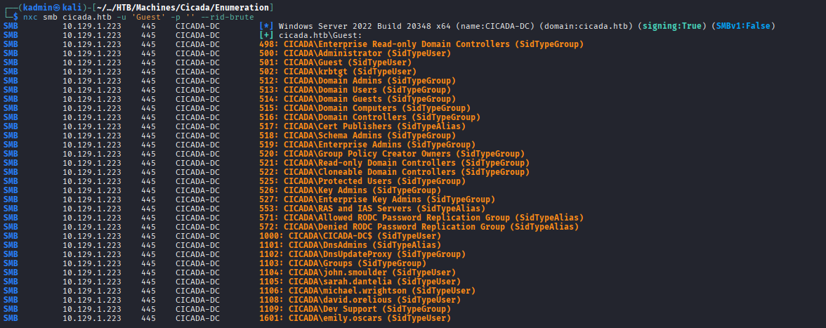 nxc smb cicada.htb -u 'Guest' -p '' --rid-brute