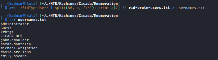 awk '/SidTypeUser/ { split($6, a, "\\"); print a[2] }' rid-brute-users.txt > usernames.txt