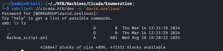 smbclient //cicada.htb/dev -U 'david.orelious'