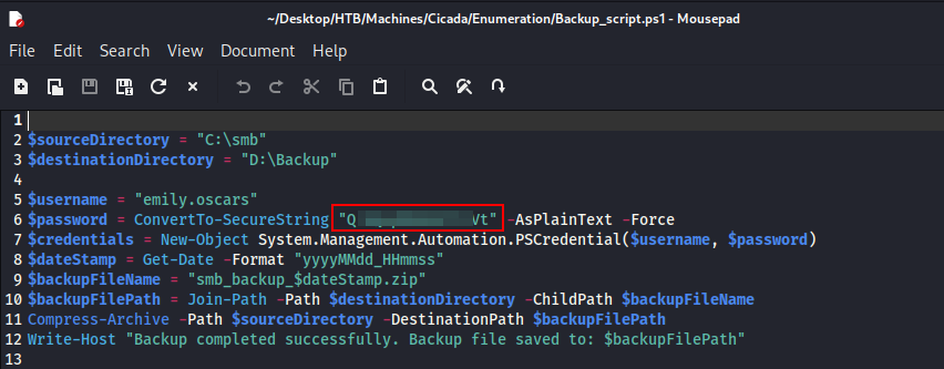 The file was a backup script and contained clear text credentials for the user emily.oscars.