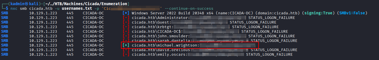 nxc smb cicada.htb -u usernames.txt -p <password> --continue-on-success