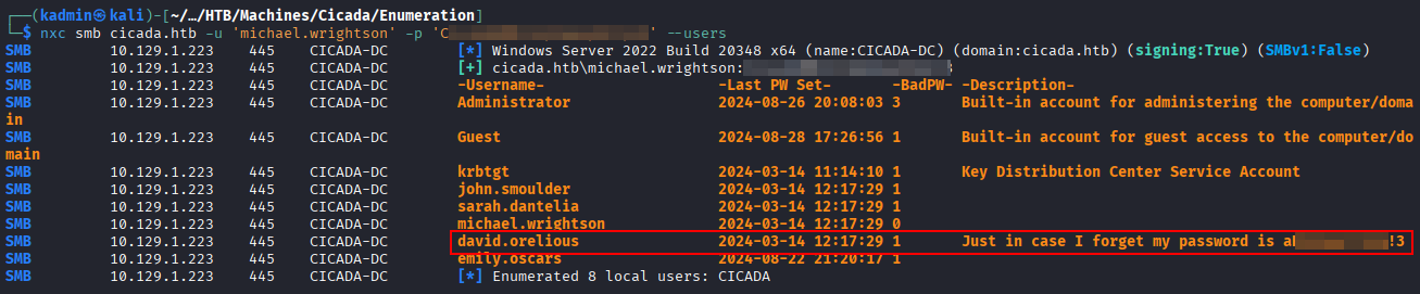nxc smb cicada.htb -u 'michael.wrightson' -p <password> --users