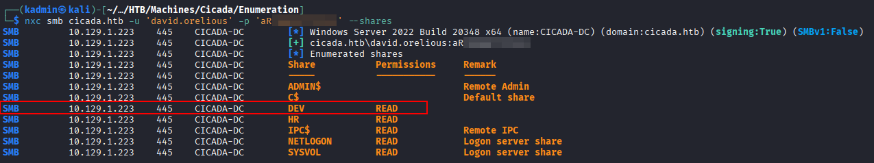 Using the credentials of david.orelious, SMB shares were enumerated again. A new readable share named DEV was identified.