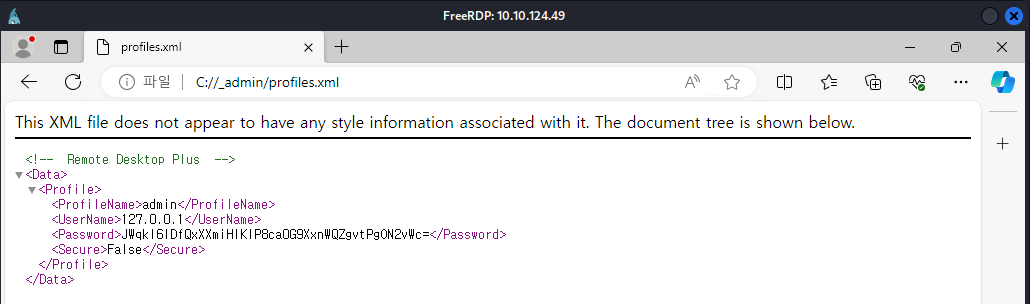 During this process, a file named profiles.xml, associated with the software Remote Desktop Plus, was identified. The file contained credentials for the admin user.