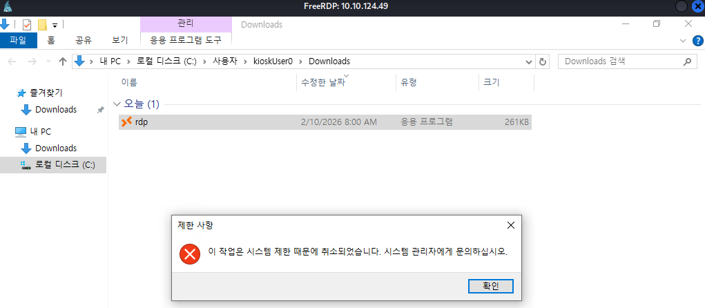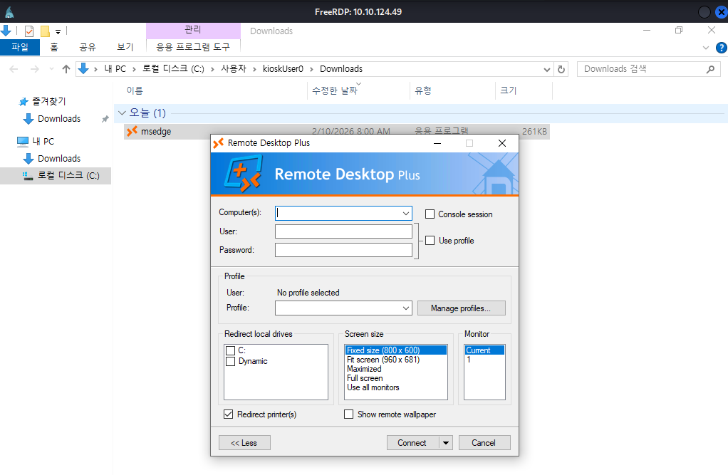 xfreerdp3 /v:10.10.124.49 /u:"KioskUser0" /p:"" /cert:ignore /sec:nla:off +clipboard