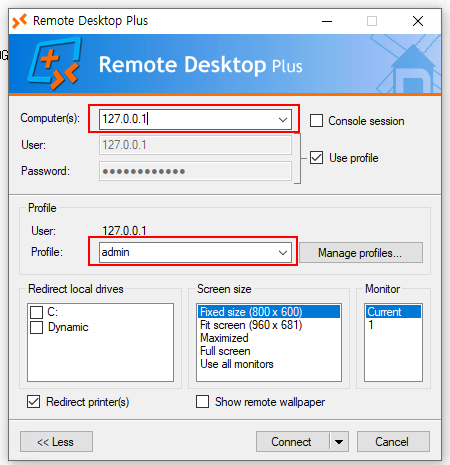 The profile was selected; however, it was not possible to establish an RDP connection to the host.