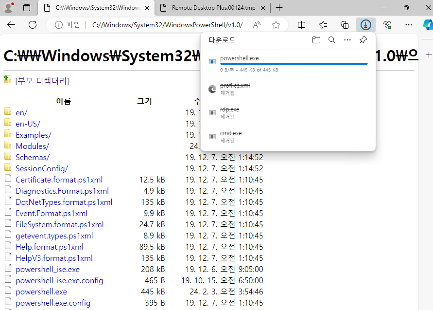 To obtain a PowerShell console and continue the attack, the PowerShell executable was downloaded to the Downloads folder and renamed to msedge.exe, following the same evasion technique described previously.