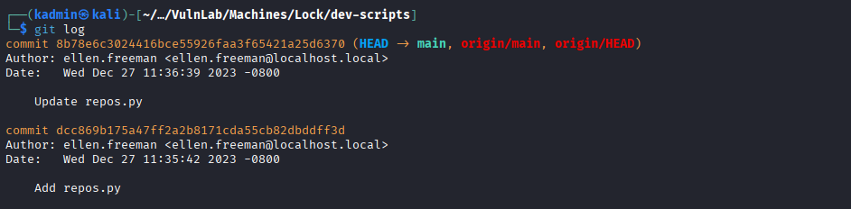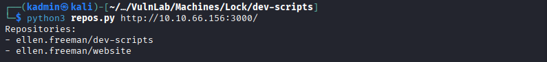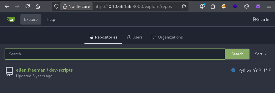 An instance of Gitea was identified on port 3000. Within this instance, a repository named dev-scripts, owned by the user ellen.freeman, was discovered.