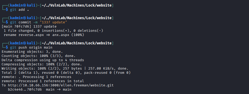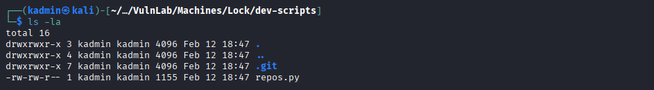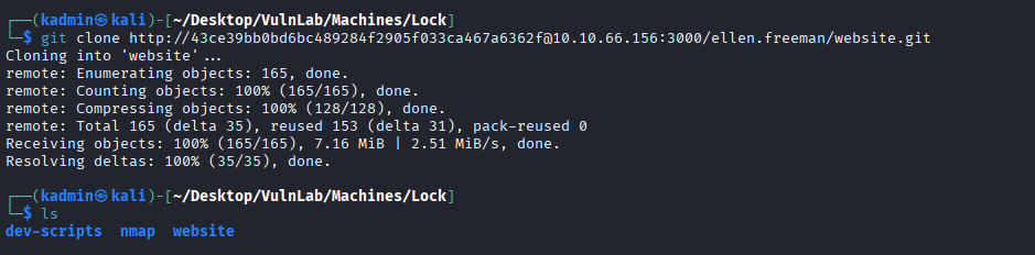 The token was confirmed to be valid, and execution of the script revealed the existence of a private repository named website. Consequently, the repository was cloned for further analysis.