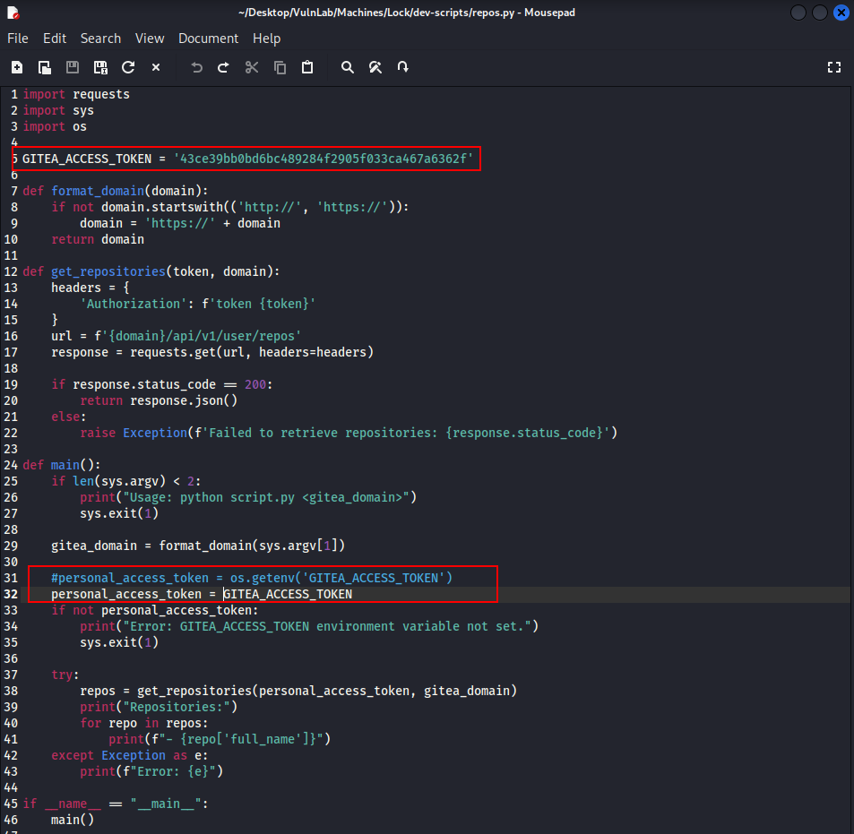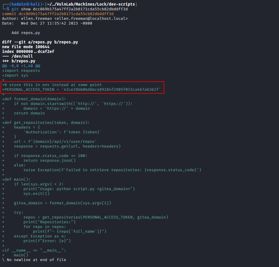 The commit contained an earlier version of the script used to enumerate the repositories of a given user (in this case, ellen.freeman). In this older version, an access token was hardcoded within the source code.