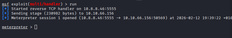 As a result, the payload became accessible through the website and could be executed to obtain a reverse shell. Prior to triggering the payload, a listener was configured in Metasploit to receive the incoming connection.