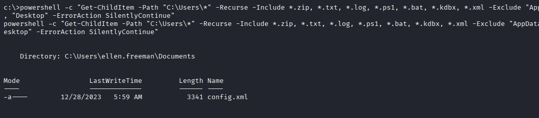 powershell -c "Get-ChildItem -Path "C:\Users\*" -Recurse -Include *.zip, *.txt, *.log, *.ps1, *.bat, *.kdbx, *.xml -Exclude "AppData", "Microsoft", "OneDrive", "Contacts", "Desktop" -ErrorAction SilentlyContinue"
