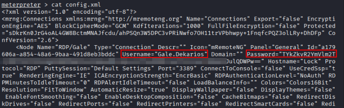 A configuration file associated with mRemoteNG was identified, containing credentials for the user Gale.Dekarios.