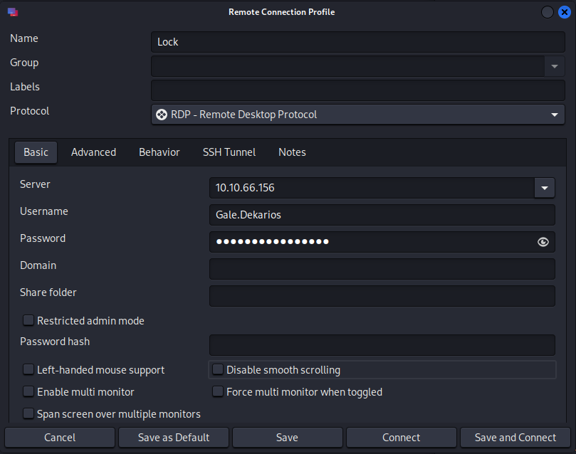 Finally, the recovered credentials were configured in Remmina to establish an RDP connection to the server.