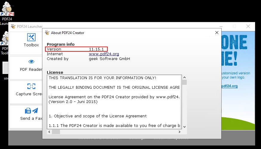 The installed version of PDF24 was first verified to confirm that it was affected by the documented vulnerability.