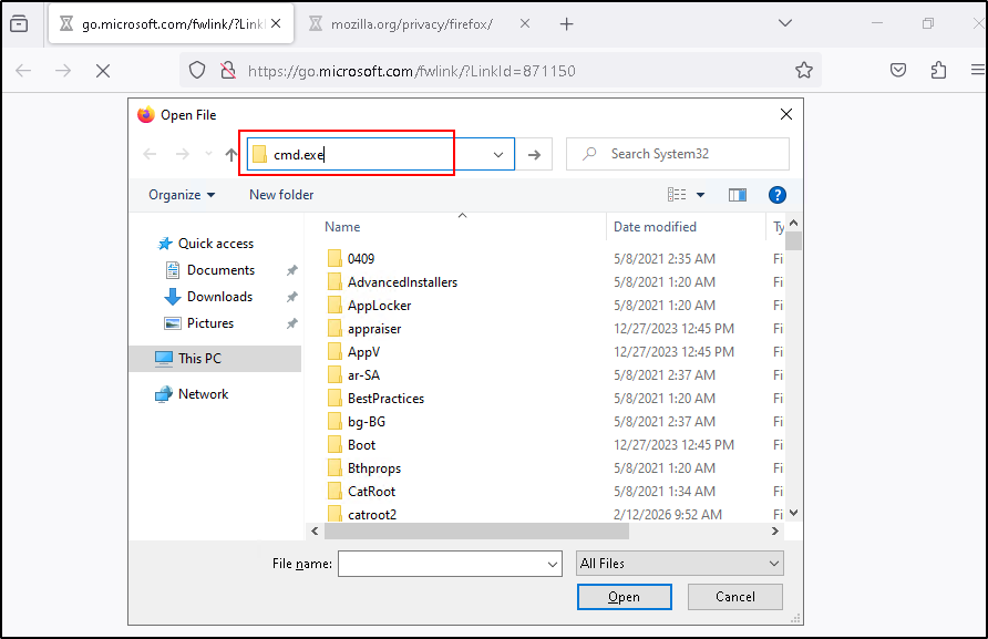 Within the newly opened browser window, the CTRL + O shortcut was pressed to invoke the file open dialog. The path cmd.exe was entered in the address bar and executed, resulting in a new command prompt running with SYSTEM privileges.